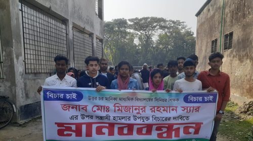 চরফ্যাশনে শিক্ষকের ওপর হামলার প্রতিবাদে শিক্ষার্থীদের মানববন্ধন