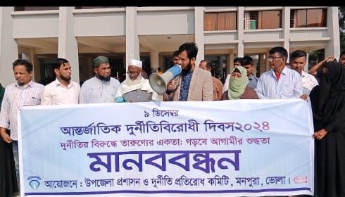 "দুর্নীতির বিরুদ্ধে তারুণ্যের একতা, গড়বে আগামীর শুদ্ধতা" প্রতিপাদ্যে ভোলার মনপুরায় আন্তর্জাতিক দুর্নীতিবারোধী দিবস পালিত হয়েছে। উপজেলা প্রশাসন ও মনপুরা দুর্নীতি প্রতিরোধ কমিটির আয়োজনে এ উপলক্ষে মানববন্ধন ও আলোচনা সভা অনুষ্ঠিত…