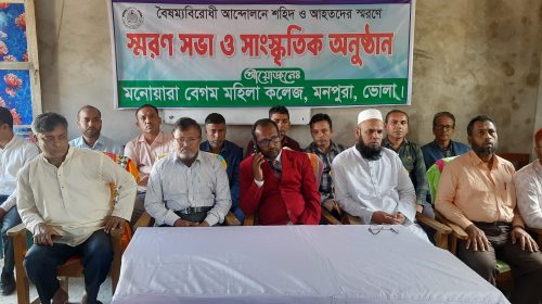 ভোলার মনপুরায় মনোয়ারা বেগম মহিলা কলেজে বৈষম্যবিরোধী আন্দোলনে শহিদ ও আহতদের স্মরণে সভা ও সাংস্কৃতিক প্রতিযোগিতা অনুষ্ঠিত হয়েছে। বৃহস্পতিবার (২৮ নভেম্বর) বেলা ১১ টায় কলেজ মিলনায়তনে এই স্মরণ সভা ও…
