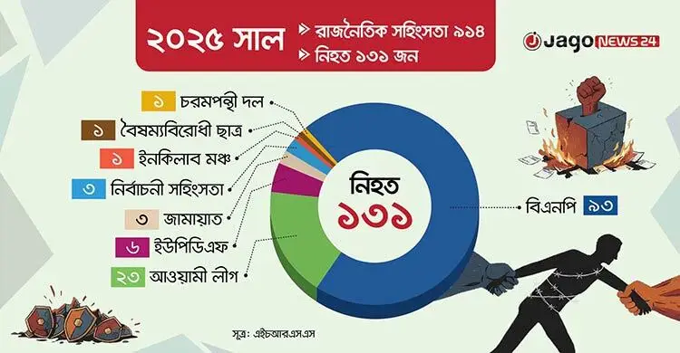 পরিসংখ্যানও বেশ উদ্বেগজনক। গত এক বছরে রাজনৈতিক সহিংসতায় দেশে নিহত হয়েছেন ১৩১ জন। মানবাধিকার সংস্থা হিউম্যান রাইটস সাপোর্ট সোসাইটির (এইচআরএসএস) বার্ষিক প্রতিবেদনে বলা হয়েছে, ২০২৫ সালে রাজনৈতিক আধিপত্য বিস্তার, প্রতিশোধপরায়ণতা, সমাবেশ ও কমিটি গঠন নিয়ে বিরোধ, নির্বাচনকেন্দ্রিক সংঘাত ও চাঁদাবাজি কেন্দ্র করে ৯১৪টি সহিংসতা ঘটে। এসব সহিংসতায় নিহত ১৩১ জনের মধ্যে বিএনপির ৯৩ জন, আওয়ামী লীগের ২৩ জন, ইউপিডিএফের ছয়জন, জামায়াতে ইসলামীর তিনজন, ইনকিলাব মঞ্চের একজন, বৈষম্যবিরোধী ছাত্র আন্দোলনের একজন ও চরমপন্থি দলের একজন আছেন। আসন্ন ত্রয়োদশ জাতীয় সংসদ নির্বাচন কেন্দ্র করে ৫৪টি সহিংস ঘটনায় নিহত হয়েছেন আরও তিনজন।