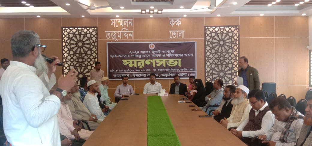 তজুমদ্দিন উপজেলা প্রশাসনের আয়োজনে ভোলার তজুমদিদনে ২০২৪ সালের জুলাই-আগস্টে ছাত্র-জনতার গণঅভ্যুত্থানে আহত ও শহিদগণের স্মরণে “স্মরণসভা” অনুষ্ঠিত হয়েছে। বুধবার (২৭ নভেম্বর) সকাল ১০টায় উপজেলা পরিষদ মিলনায়তনে তজুমদ্দিন উপজেলা নির্বাহি কর্মকর্তা শুভ দেবনাথের সভাপতিত্বে স্মরণসভায় বক্তৃতা করেন, তজুমদ্দিন উপজেলা বিএনপির আহবায়ক গোলাম মোস্তফা মিন্টু, উপজেলা জামায়াতে ইসলামীর আমির মাও. আব্দুর রব, বাংলাদেশ খেলাফত মজলিসের সভাপতি মাও. আব্দুর রাজ্জাক, তজুমদ্দিন থানার অফিসার ইনচার্জ আব্দুল্যাহ আল নোমান, প্রেসক্লাবের যুগ্ম-আহবায়ক ও দৈনিক নয়া দিগন্তের তজুমদ্দিন উপজেলা সংবাদদাতা হেলাল উদ্দিন লিটন, যুগ্ম-আহবায়ক ছাইদুল হক মুরাদ, বাংলাদেশ হিন্দু বৌদ্ধ খ্রিষ্টান ঐক্য পরিষদের সাধারণ সম্পাদক বিধূ ভূষন রায়, ছাত্র অধিকার পরিষদের ভোলা জেলা সহ-সভাপতি হাসনাঈন তানভীর, জুলাই-আগষ্টের গণঅভ্যুত্থানে খুনিদের গুলিতে তজুমদ্দিনের একমাত্র শহীদ মনিরের স্ত্রী রোজিনা বেগম, তার পিতা মোঃ আব্দুল মন্নান, ইসলামিক ফাউন্ডেশনের তজুমদ্দিন উপজেলা কো-অডিনেটর নুরুল ইসলাম, ঢাকা গুলিবিদ্ধ ছাত্র আশ্রাফুল ইসলাম নিশাদ প্রমুখ। অনুষ্ঠানে বক্তারা বলেন, জুলাই-আগষ্টের ছাত্র-জনতার গণঅভ্যুত্থান শুধু বাংলাদেশে নয় পুরো এশিয়া মহাদেশে বৃহত্তর গণঅভ্যুত্থান। ছাত্র-জনতার আন্দোলনে স্বৈরাচারের পতনের মাধ্যমে দেশ দ্বিতীয়বার স্বাধীন হলো। দ্বিতীয়বার স্বাধীনতার মূল কারিগর আহত ও নিহতদের জাতে জাতি ভূলে না যায় সেদিকে সজাগ দৃষ্টি রাখতে হবে।