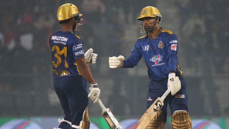 তার সঙ্গে সেঞ্চুরি করেন ওপেনার তানজিদ তামিম। বাঁ-হাতি এই ওপেনার খেলেন ৬৪ বলে ১০৮ রানের ইনিংস। বিপিএলে দ্বিতীয় সেঞ্চুরি ইনিংসটি তিনি ছয়টি চারের সঙ্গে আটটি ছক্কা সাজান। তাদের জুটি থেকে আসে ২৪১ রান। বিপিএলে যা সর্বোচ্চ জুটির রেকর্ড।