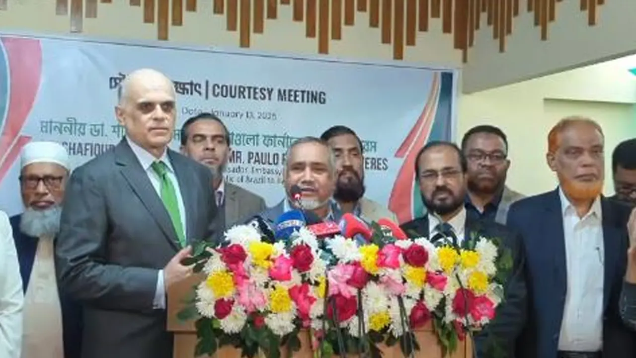 সোমবার (১৩ জানুয়ারি) সকালে রাজধানীর মগবাজারে বাংলাদেশ জামায়াতে ইসলামীর কেন্দ্রীয় কার্যালয়ে দলের আমির ডা. শফিকুর রহমানের সঙ্গে সৌজন্য সাক্ষাৎ করেন বাংলাদেশে নিযুক্ত ব্রাজিলের রাষ্ট্রদূত পাওলো ফারনান্দো দিয়াস ফেরেস। সাক্ষাৎ শেষে আয়োজিত সংবাদ সম্মেলনে সাংবাদিকদের প্রশ্নের জবাবে ডা. তাহের এসব কথা বলেন।