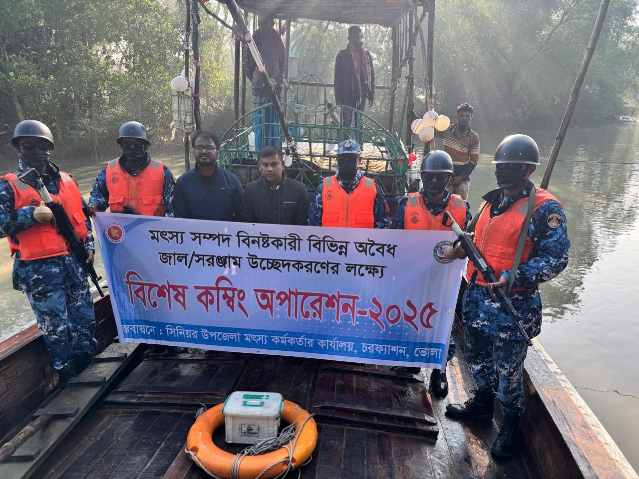 ভোলার চরফ্যাশনে মেঘনা নদীতে অভিযান চালিয়ে ৯ টি নোঙর এবং বিভিন্ন প্রজাতির ৫০ কেজি মাছ, ও ৫২ টি বেহুন্দি জাল জব্দ করা হয়। পরে জব্দকৃত জাল আগুনে পুড়িয়ে বিনষ্ট করা হয়। আটককৃত ৯ নোঙর নিলামে ২০ হাজার টাকা বিক্রি করে সরকারি কোষাগরে জমা দেয়া হয়। এবং ৫০ কেজি মাছ গরীব ও দুস্থ মানুষের মাঝে বিতরণ করা হয়েছে।