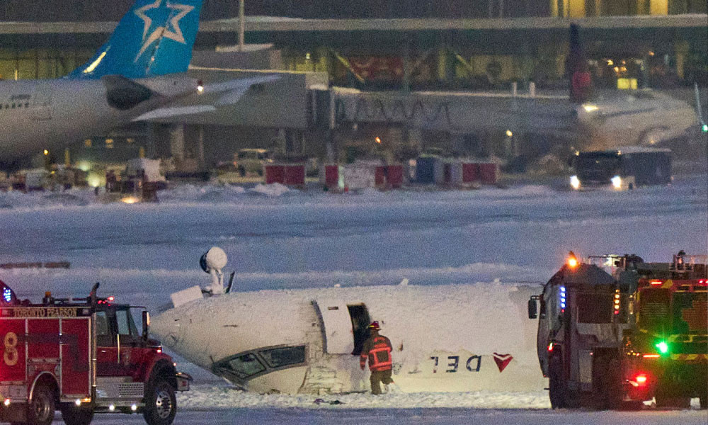 স্থানীয় সময় বিকালে যুক্তরাষ্ট্রের মিনেসোডা থেকে ৭৬ যাত্রী ও ৪ ক্রু নিয়ে ডেল্টা এয়ার লাইনের উড়োজাহাজটি টরোন্টোর পিয়ারসন আন্তর্জাতিক বিমানবন্দরে অবতরণের সময় এ দুর্ঘটনা ঘটে। তবে কী কারণে বিমানটি উল্টে গেল তা জানা জায়নি।