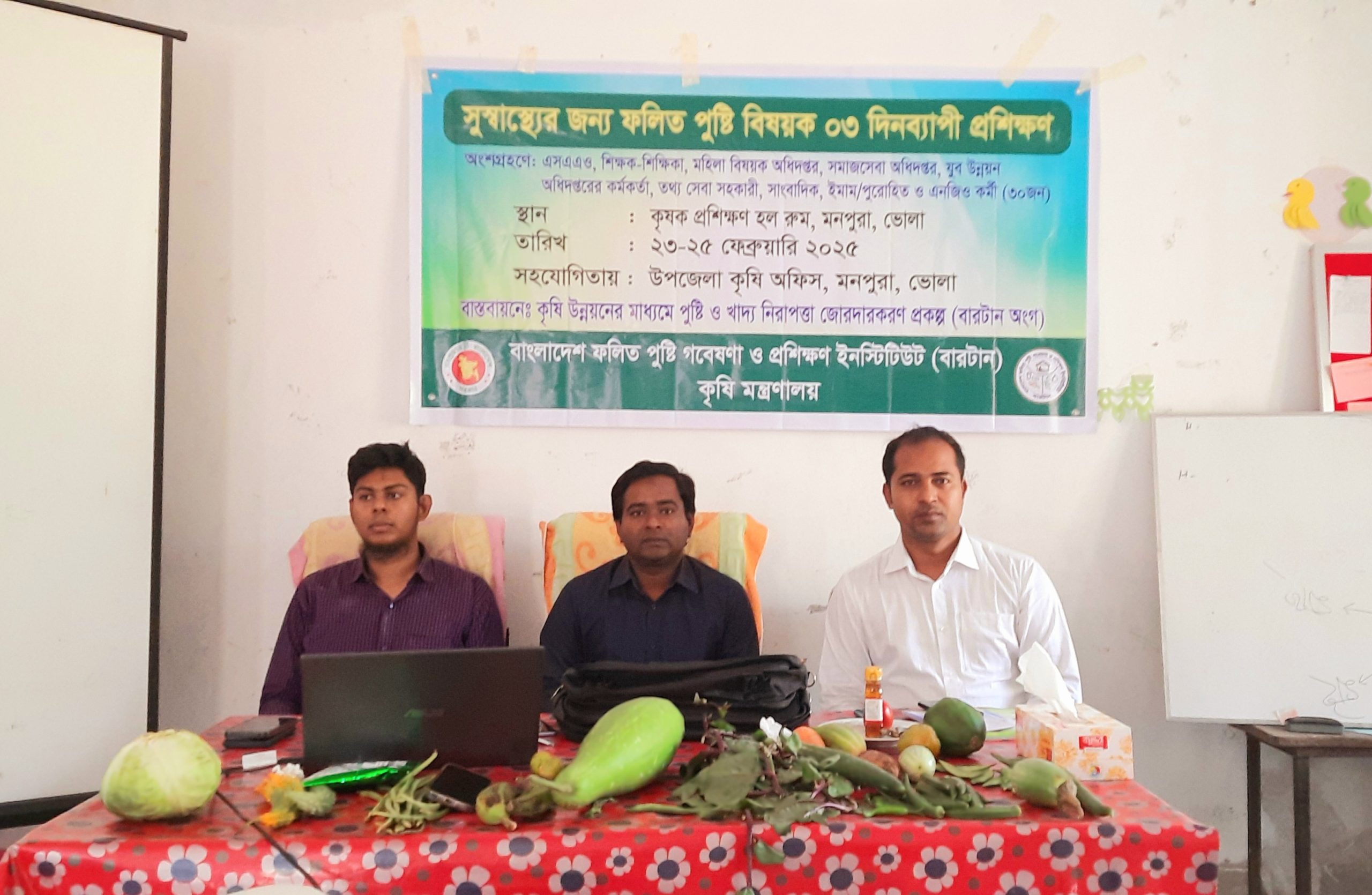 প্রশিক্ষণে সেশন পরিচালনা করেন, উপজেলা কৃষি কর্মকর্তা মোঃ আহসান তাওহীদ, কৃষি সম্প্রসারন কর্মকর্তা মাহমুদ আব্দুল্লাহ আল নোমান, বাংলাদেশ ফলিত পুষ্টি গবেষণা ও প্রশিক্ষণ ইনস্টিটিউট (বারটান) এর প্রশিক্ষক দীপ্রজিত সরকার ও সহকারি বৈজ্ঞানিক কর্মকর্তা মোঃ কাওছার আহমেদ প্রমূখ।