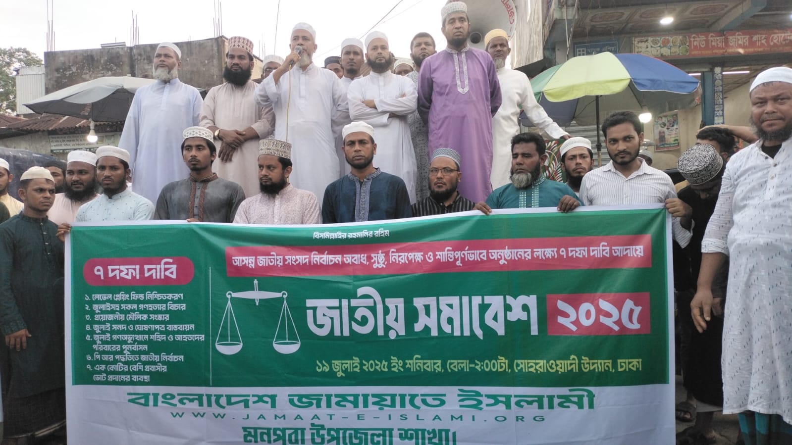 ১৯ জুলাই ঢাকার সোহরাওয়ার্দী উদ্যানে অনুষ্ঠিত জাতীয় সমাবেশ সফল ও বাস্তবায়নে ভোলার মনপুরায় স্বাগত মিছিল ও সমাবেশ করে উপজেলা জামায়াত ইসলাম।
