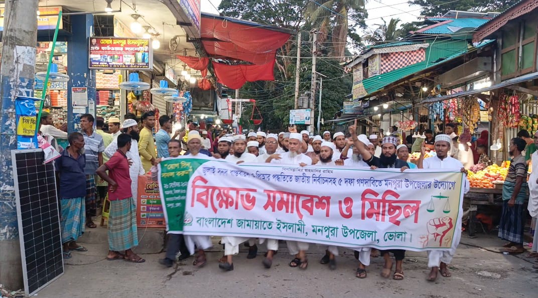 ৫ দফা দাবি বাস্তবায়নের লক্ষ্যে বিক্ষোভ মিছিল করেছে বাংলাদেশ জামায়াত ইসলামি মনপুরা উপজেলা শাখা।
