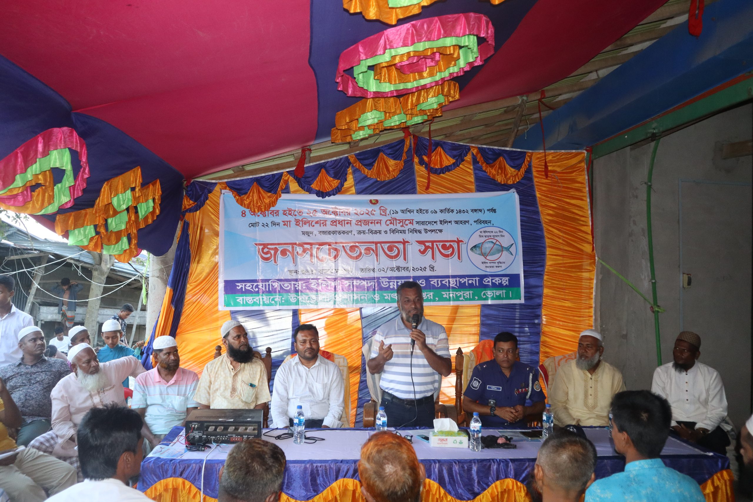 ভোলার মনপুরায় ইলিশের প্রধান প্রজনন মৌসুমে মা ইলিশ সংরক্ষণ অভিযান-২০২৫ বাস্তবায়নের লক্ষ্যে মৎস্যজীবীদের নিয়ে সচেতনতা সভা অনুষ্ঠিত হয়েছে।